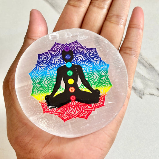 Chakra Symbols Selenite Plate – Energy Alignment & Spiritual Healing