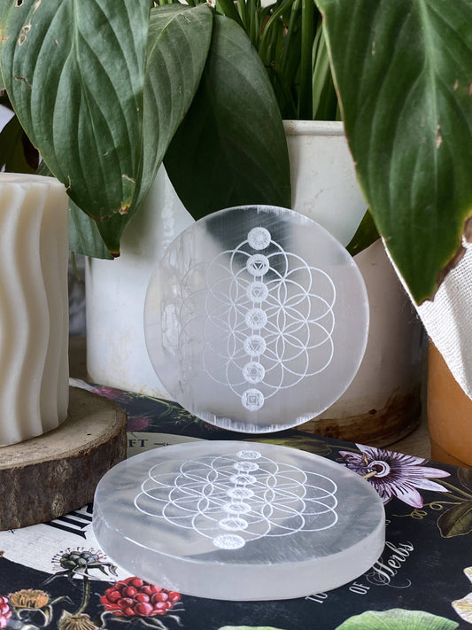 Flower of life with seven chakra symbol Carved Selenite Plate