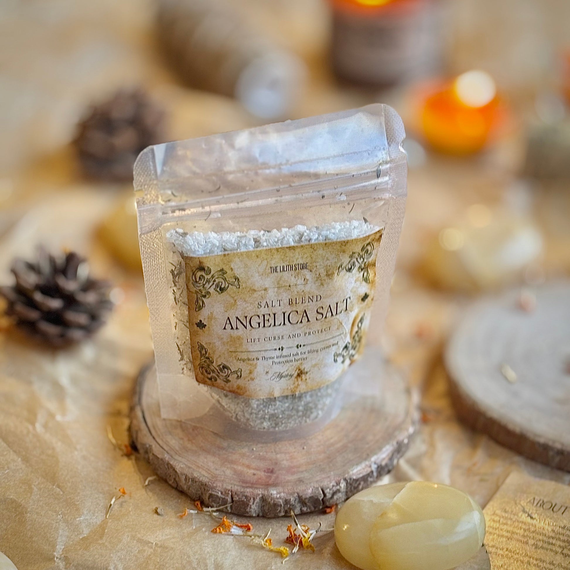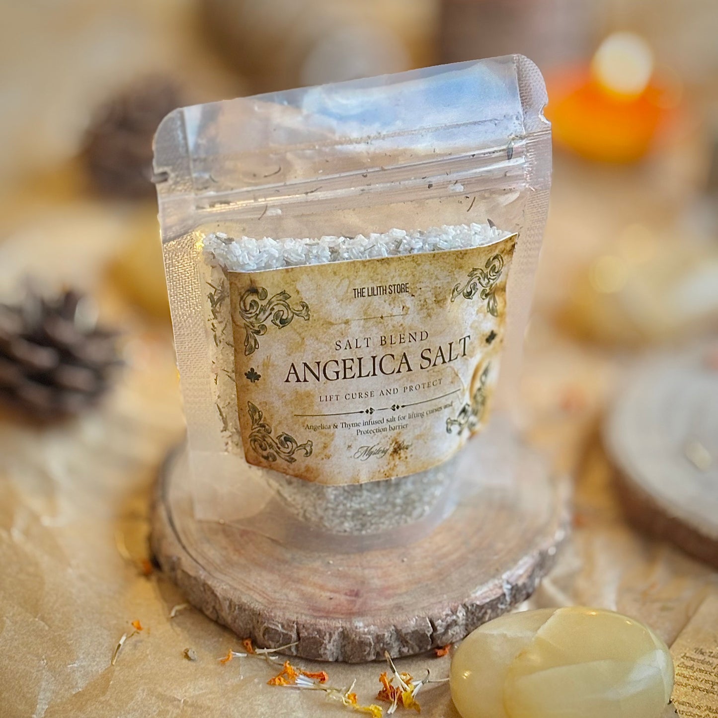 Lift Curse & Protection Salt Blend is a potent ritual salt crafted with Angelica, Thyme, and other sacred herbs traditionally used to break curses, dispel negativity, and provide strong spiritual protection. Sprinkle it around doorways, windows, or room corners to establish a protective boundary, or use it to sprinkle around candles and altar tools during rituals for amplified shielding energy. You can also fill a small sachet with the blend and carry it with you for ongoing personal protection.