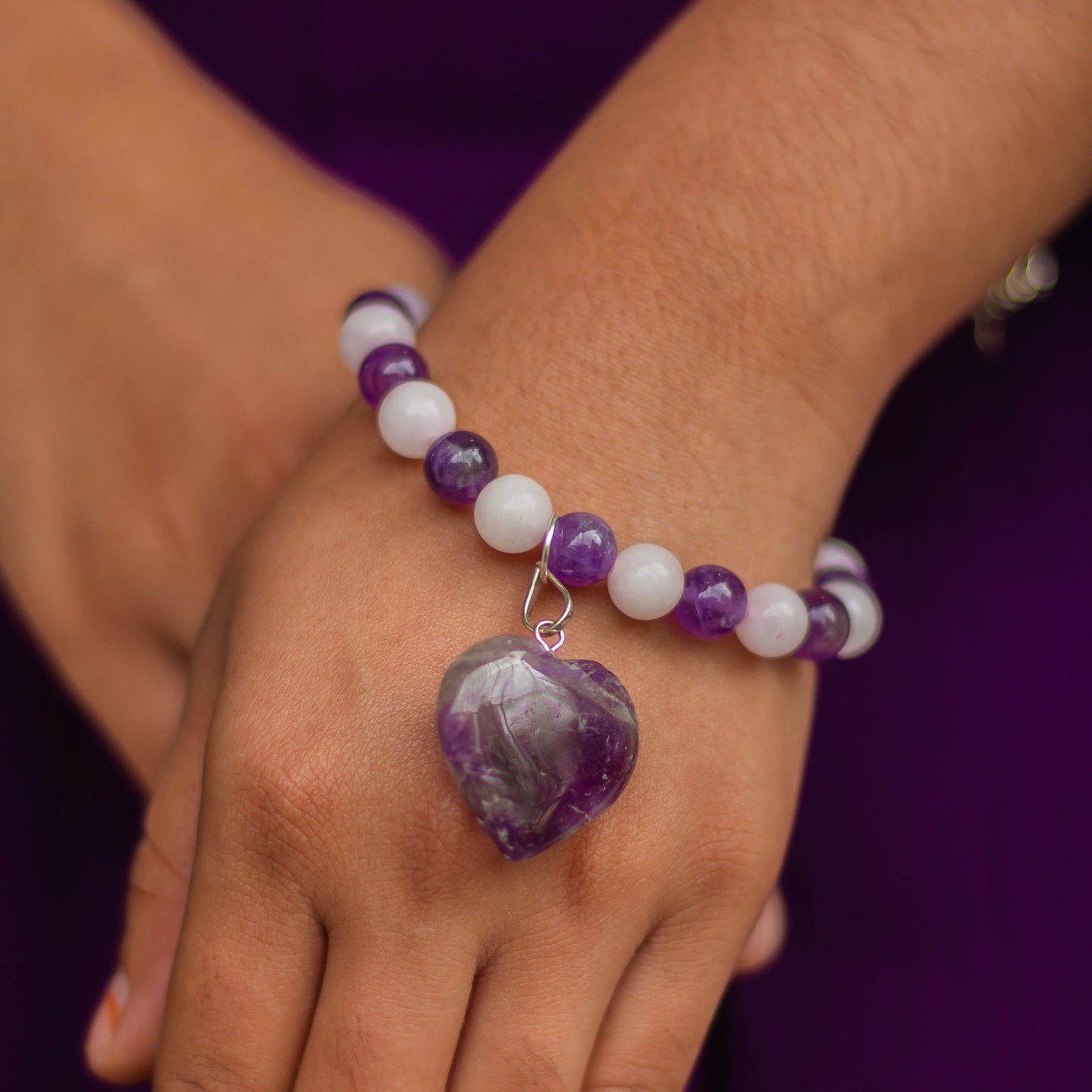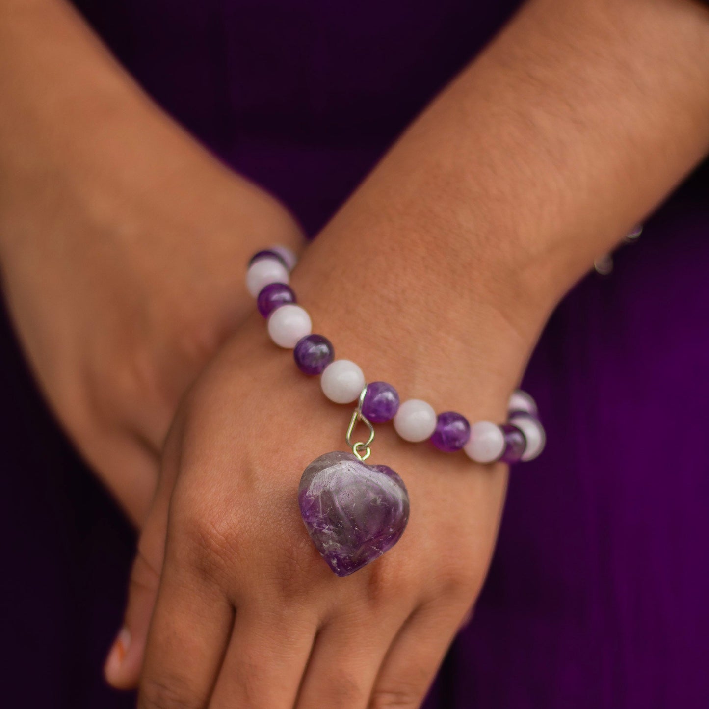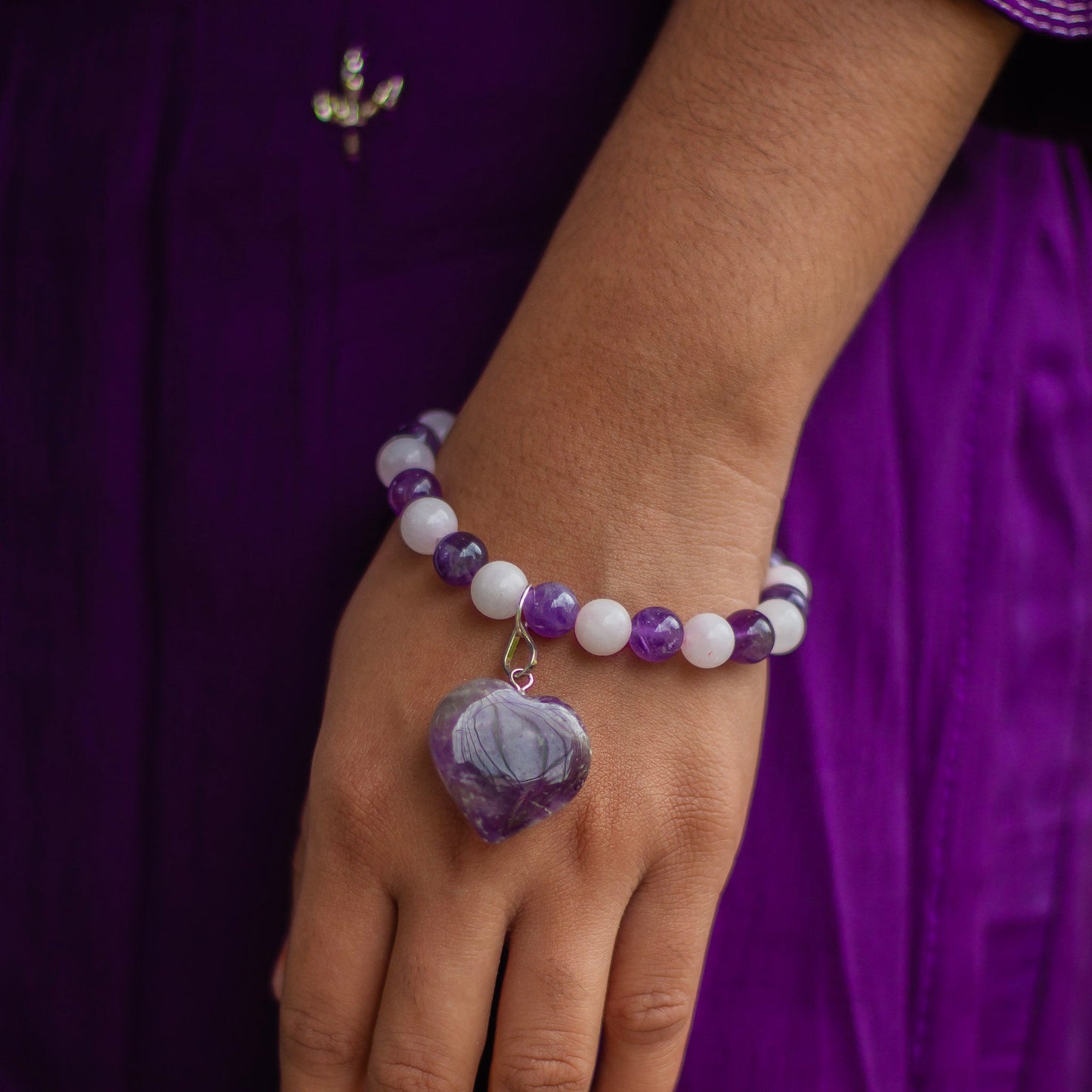 Crafted with Rose Quartz, Amethyst beads and Amethyst heart Charm on nylon thread