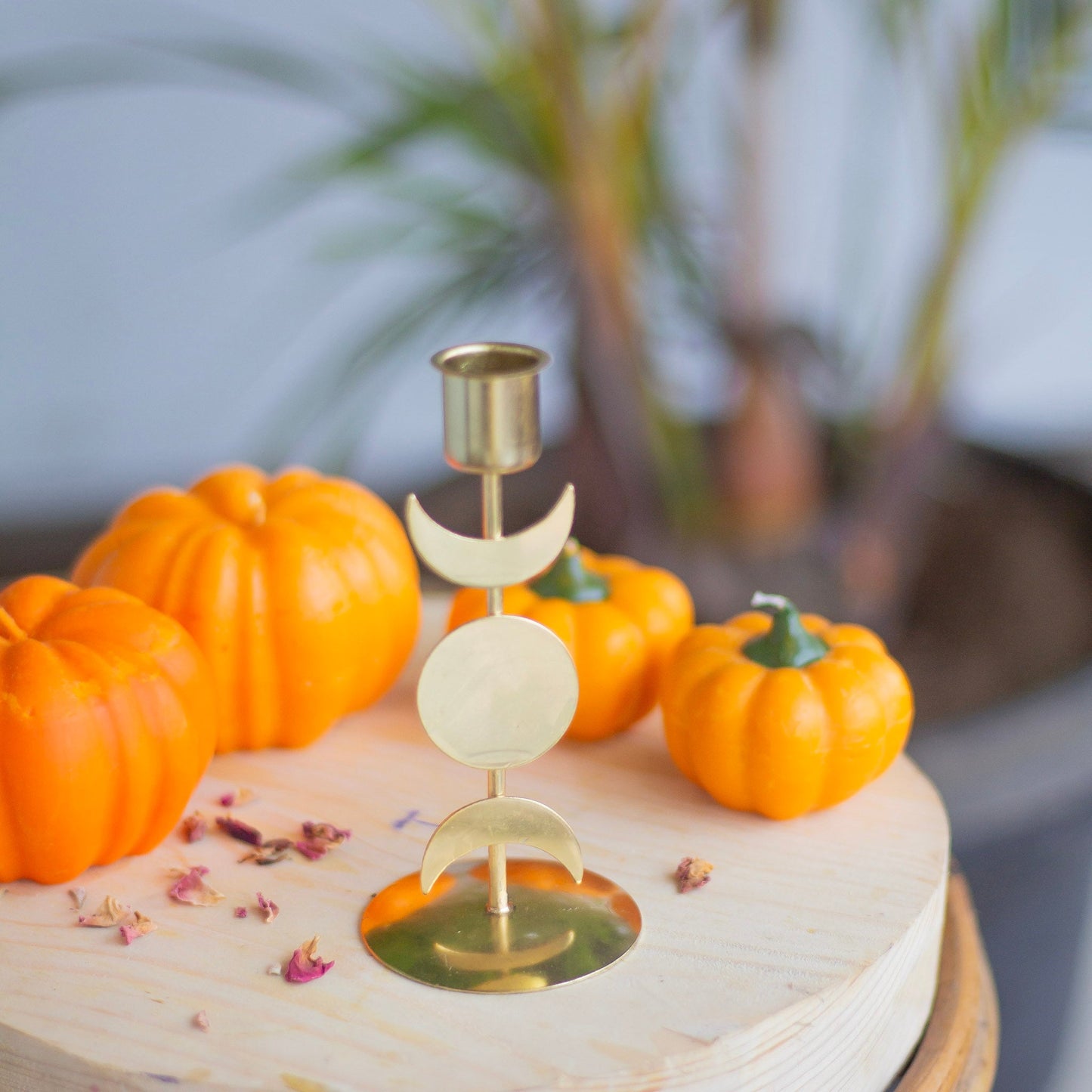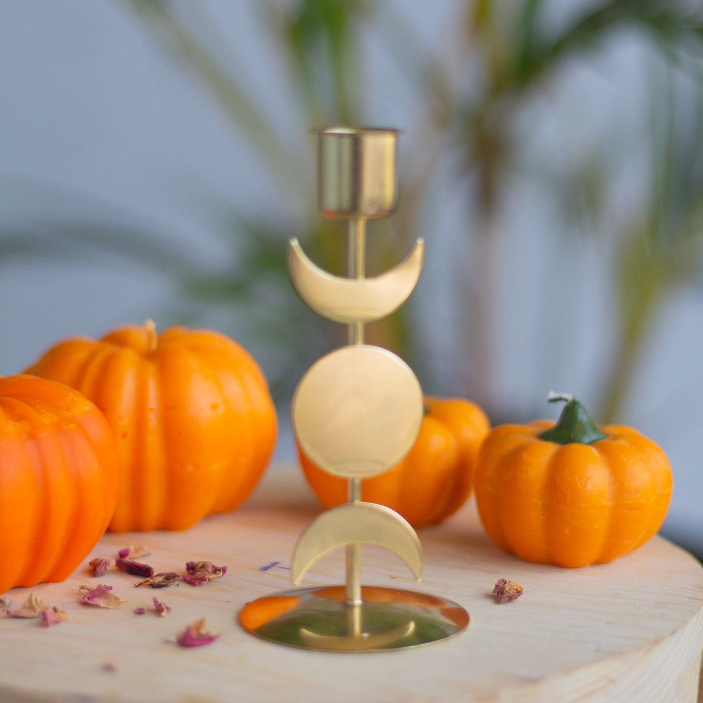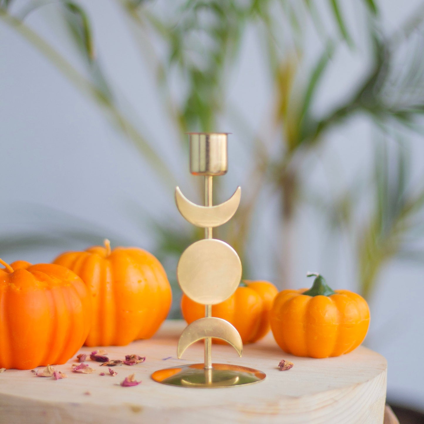 This solid brass Candle Holder has a beautiful Triple moon gold finish and is 4 inches in size. Create a tranquil environment with its unique decorative style. Perfect for your home or special events.