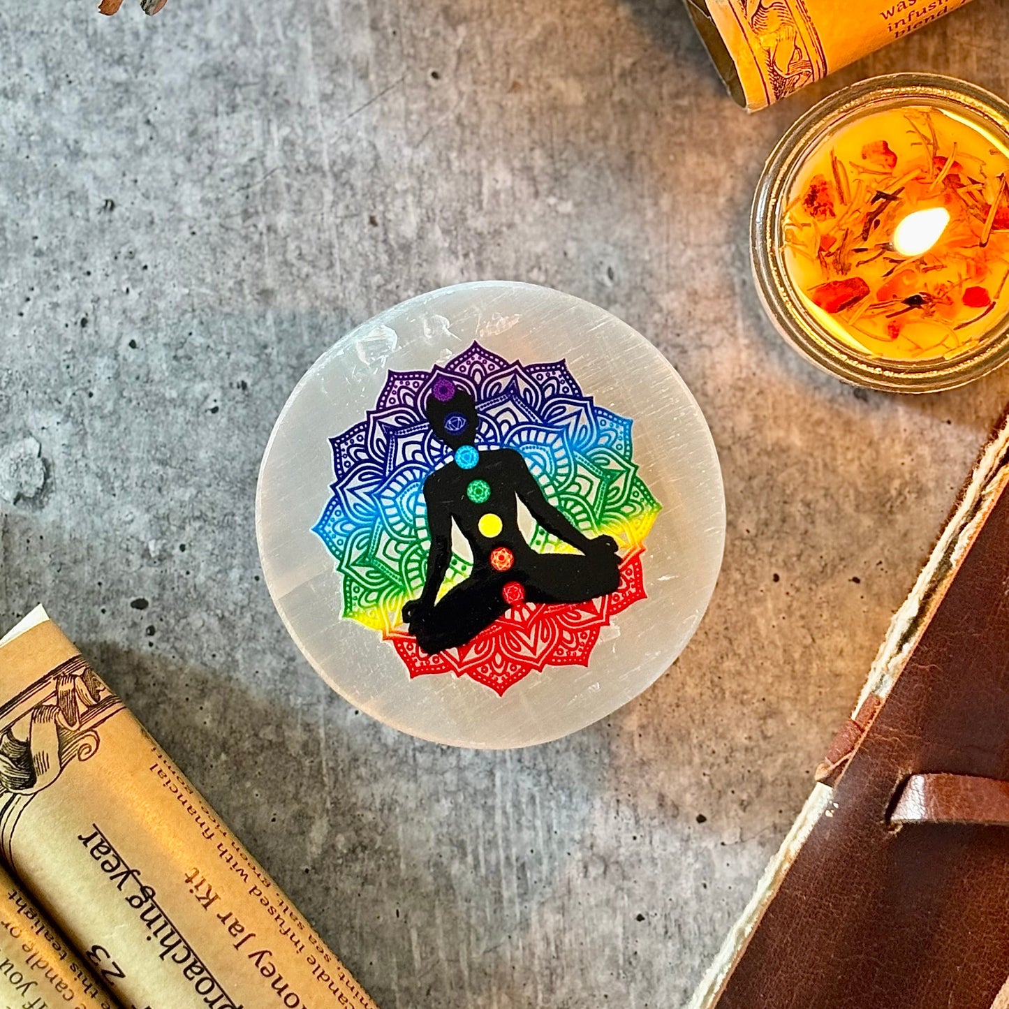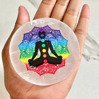 Balance and align your energy with this Chakra Symbols-etched Selenite Plate, a powerful tool for cleansing, healing, and spiritual growth. Featuring the seven chakra symbols, this plate enhances energy flow, promotes harmony, and clears negativity. Selenite is known for its high-vibrational properties, making it ideal for meditation, crystal charging, and energy work.