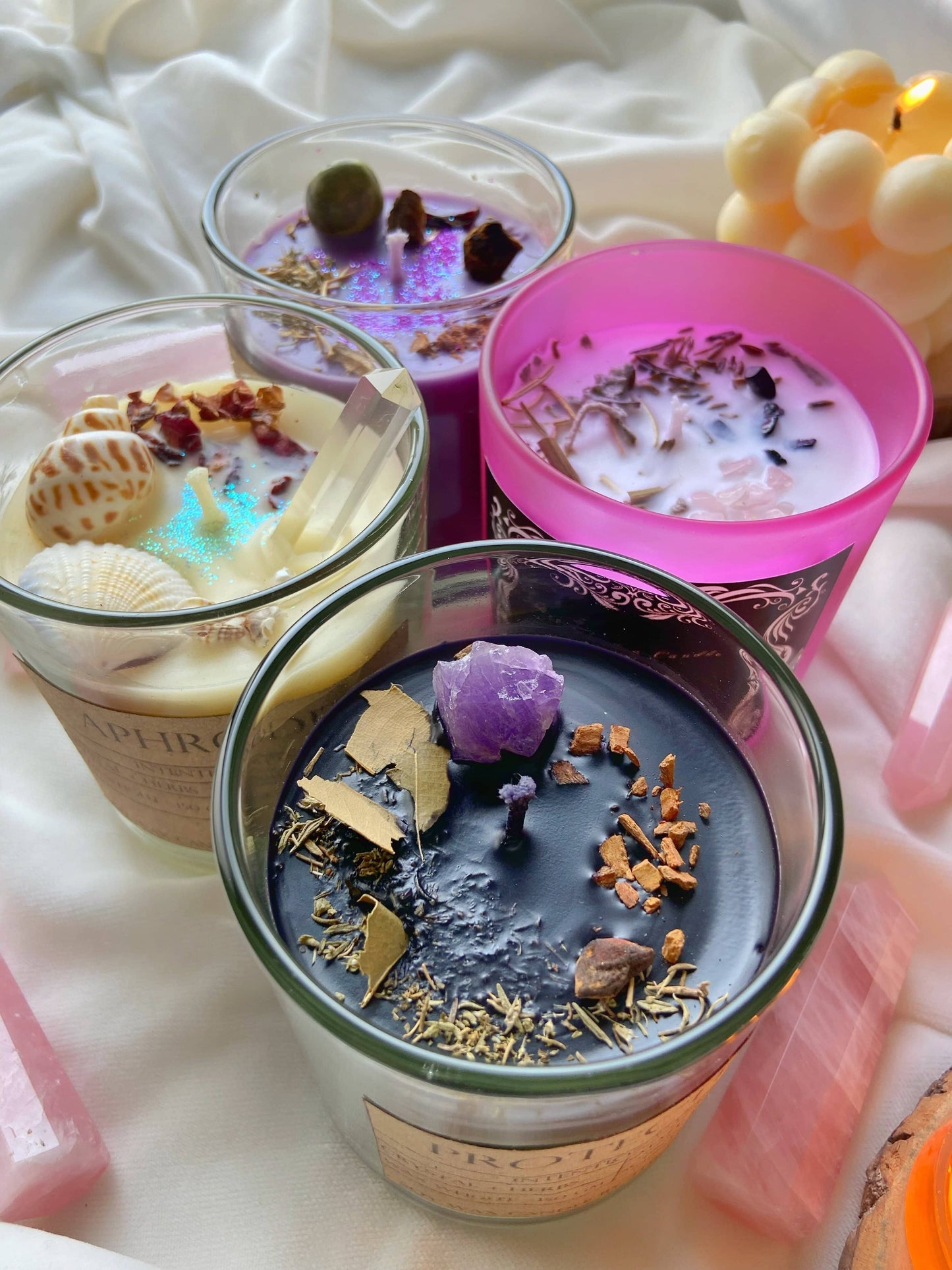 Scented Colour Intention Candle for working on clairvoyance, Candle Contains Unakite Stone, Hibiscus, Mugwort, Angelica & Rue etc.