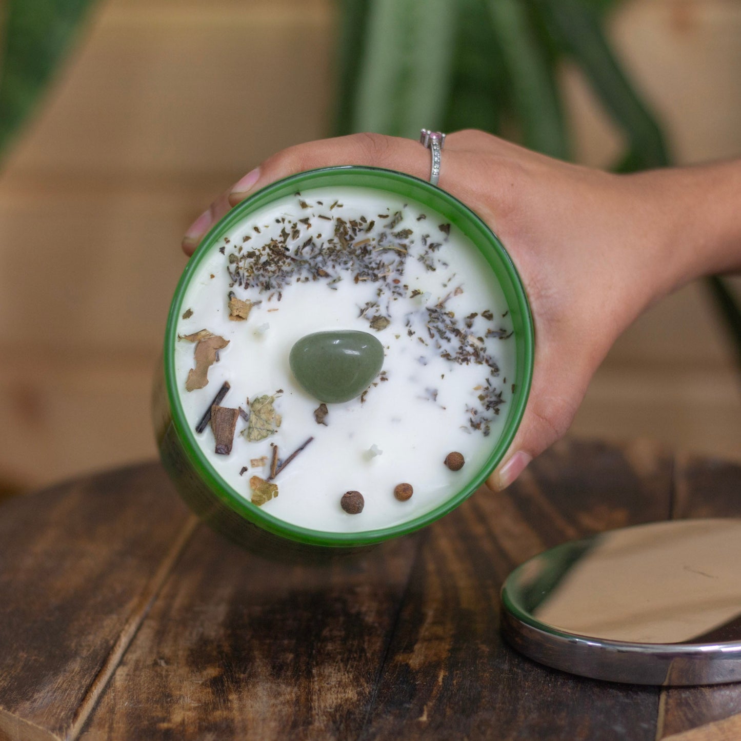 The candle is carefully infused and dressed with powerful herbs, such as peppermint and galangal. Topped with a Green Aventurine tumble, this crystal can be taken off the candle before lighting to focus your intentions and visualize your goals. For extra effect, hold the crystal in your dominant hand.