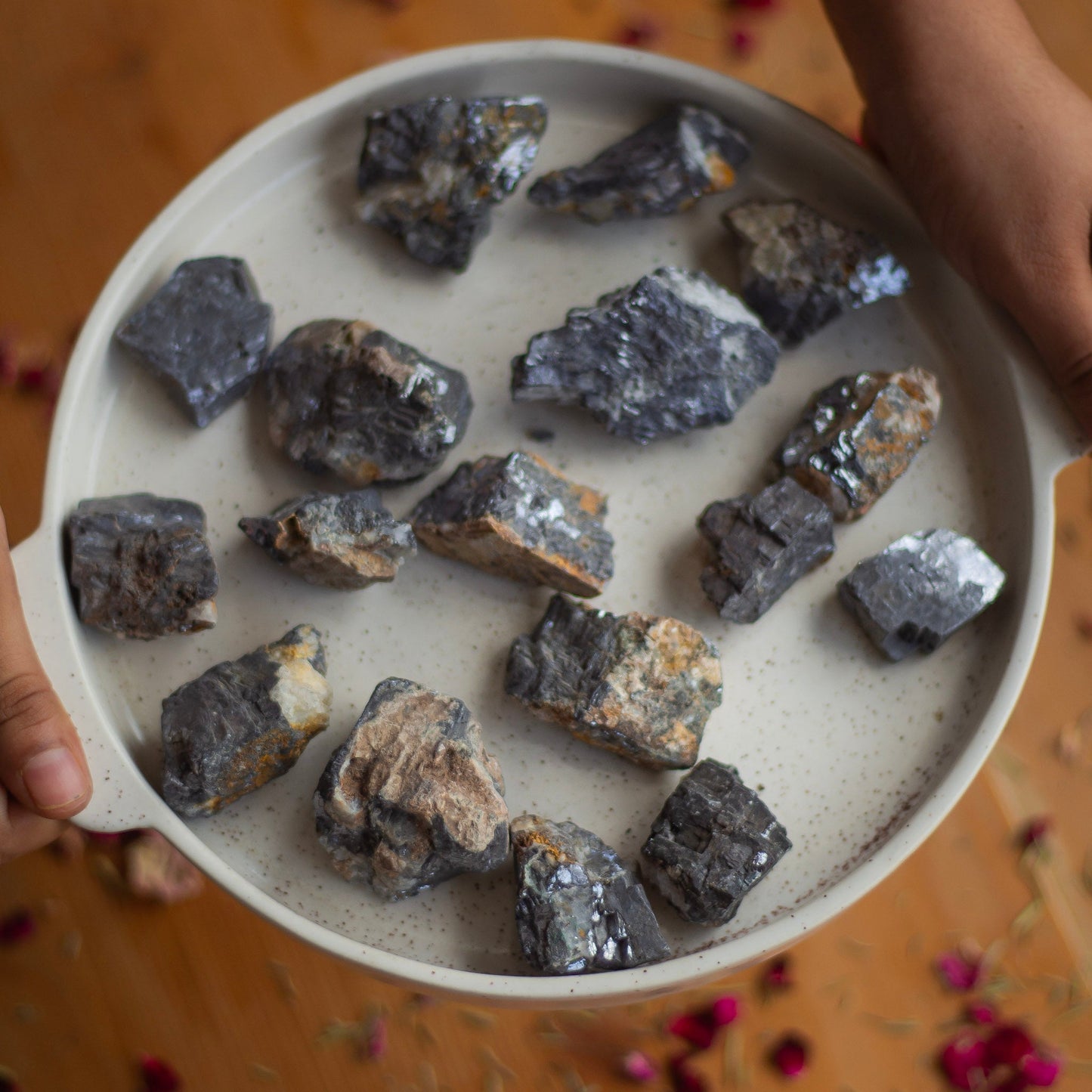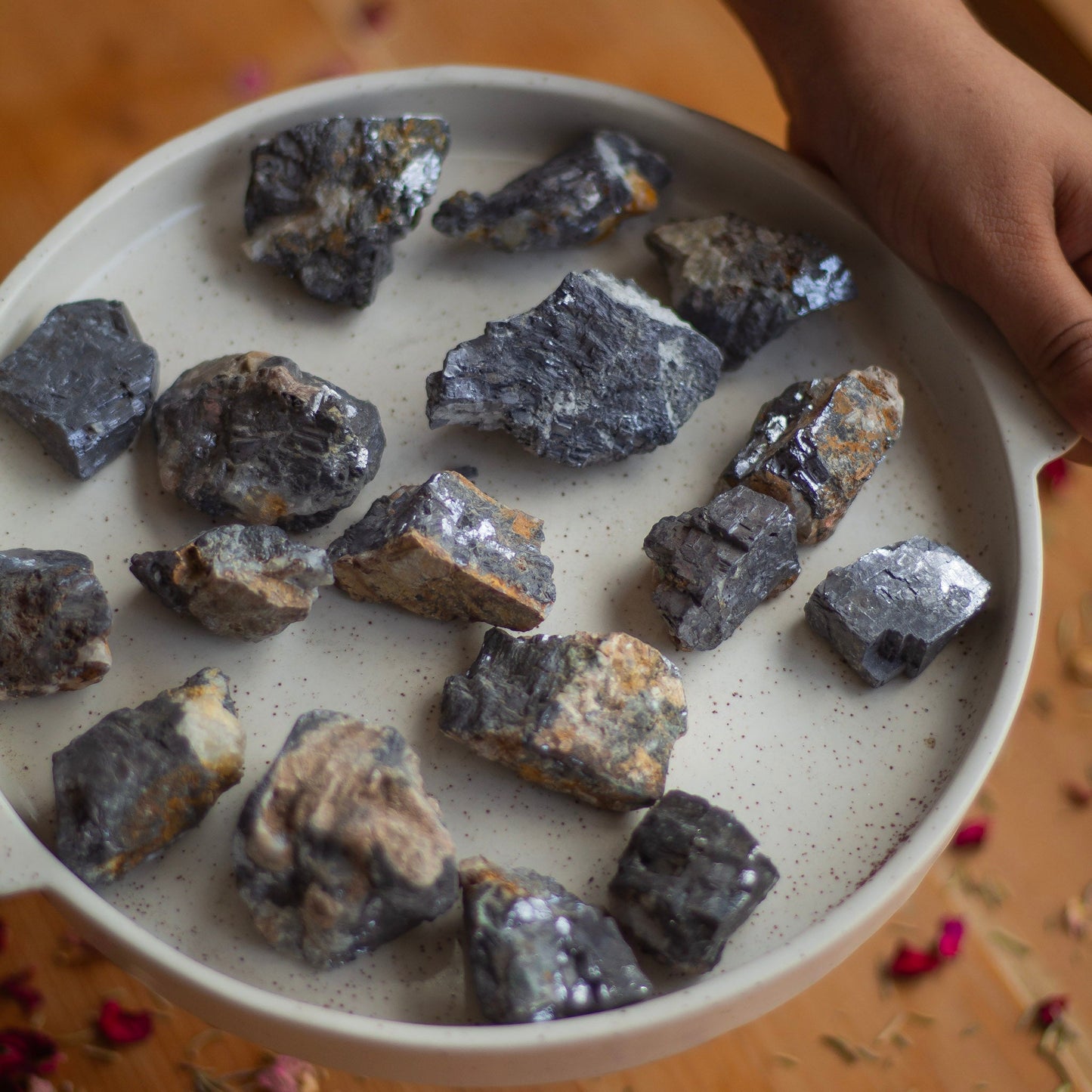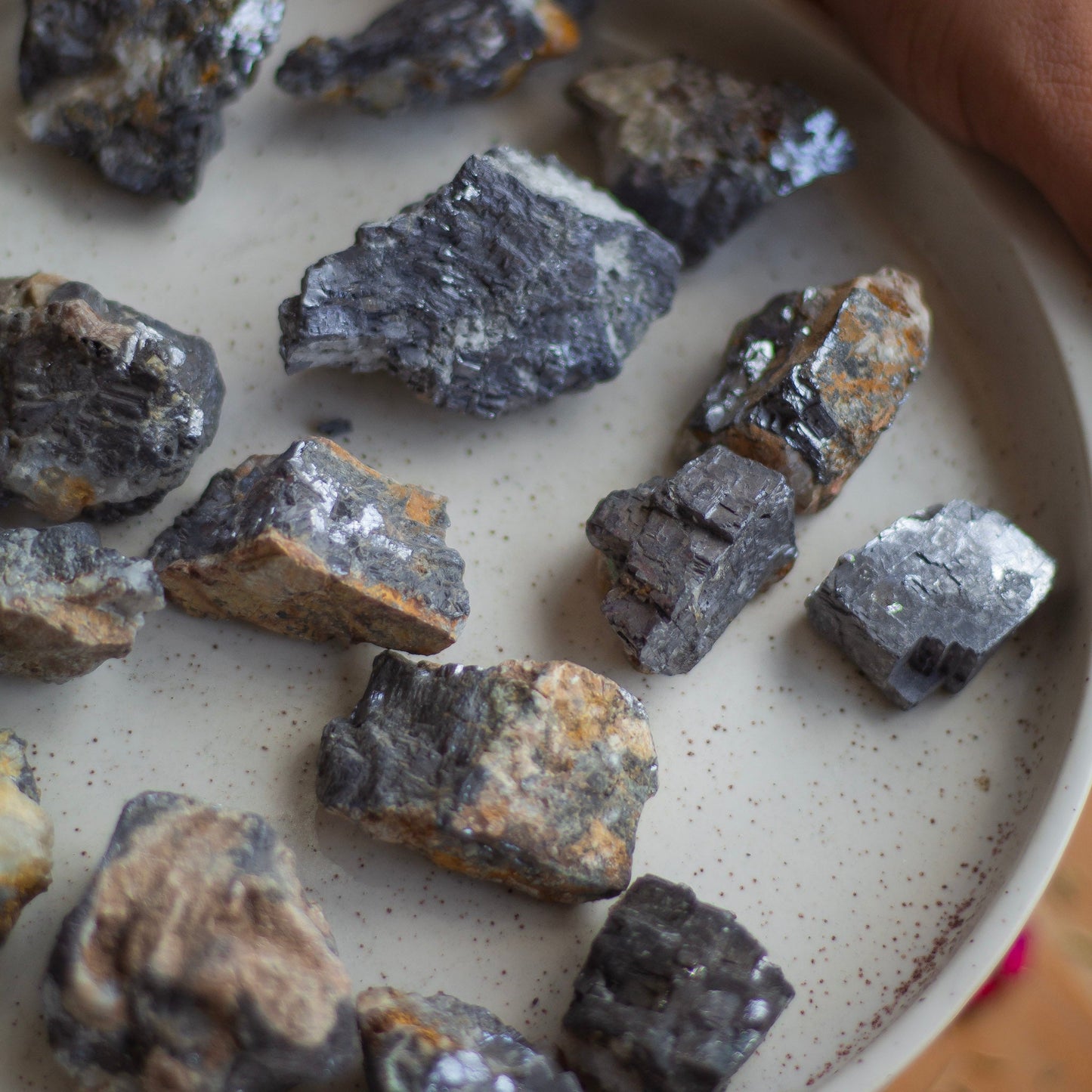 Galena, a raw stone renowned for its lead sulfide composition, offers a plethora of metaphysical benefits and raw stone properties. Its grounding nature fosters stability and security, anchoring one's energy to the Earth and shielding against negative influences. Galena facilitates transformation and manifestation, encouraging personal growth and the release of old patterns. It is believed to enhance psychic abilities and intuition, aiding in spiritual insights and divination practices. Additionally, galena supports physical healing, particularly related to the nervous system and circulation, while promoting emotional balance and alignment. Associated with the root chakra, it ensures a solid foundation for spiritual development and fosters a sense of inner peace and harmony.