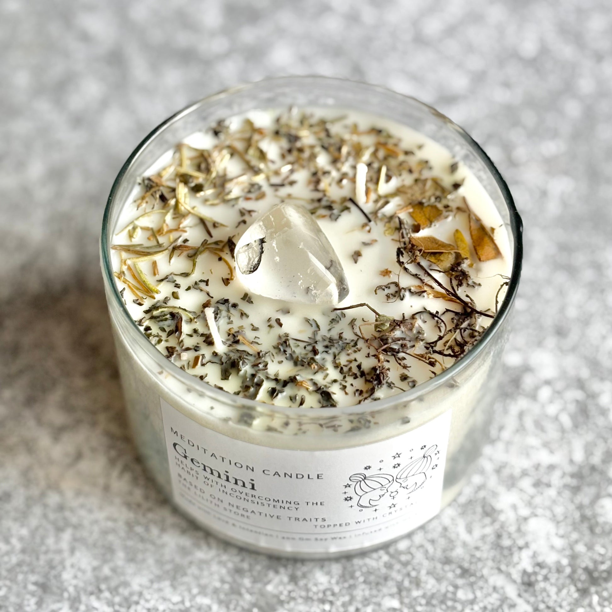 Overcome lack of consistency, decision-making struggles, and direction with this intention candle, infused with Rosemary, Basil, Peppermint, Mugwort, and more. Made with soy wax and topped with a Clear quartz tumble, it weighs approximately 400 gm and is perfect for meditation.