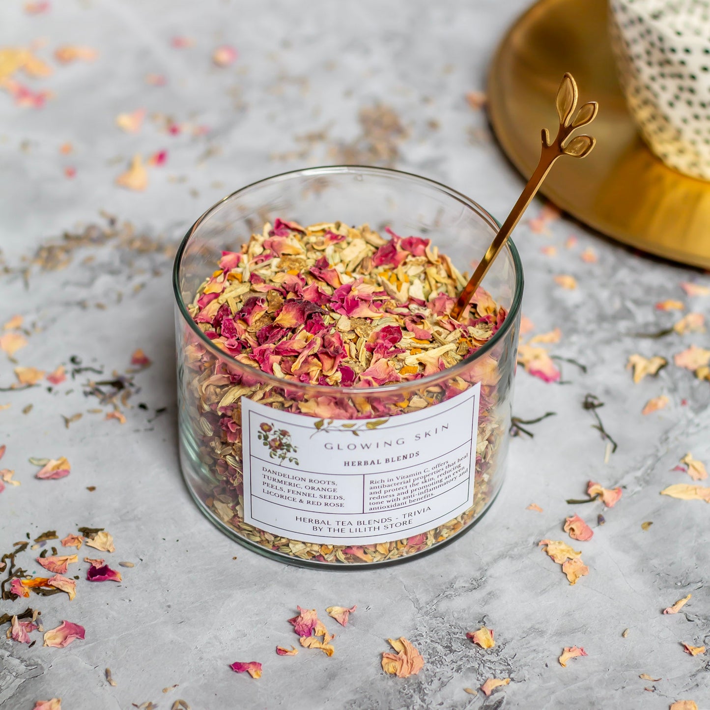 The tea blend includes dandelion roots, turmeric, orange peel, fennel seeds, licorice, and red rose.