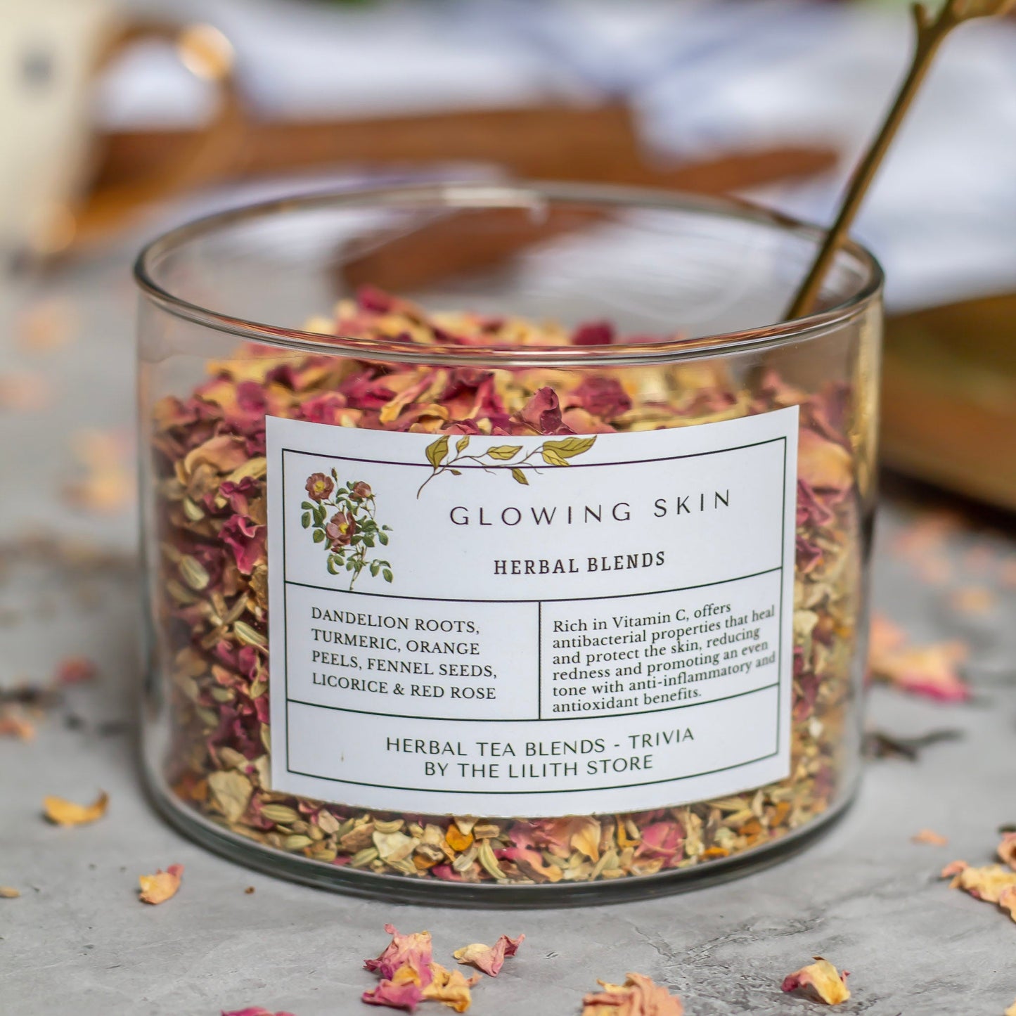 Dandelion roots promote grounding and resilience, while turmeric enhances purification and spiritual clarity. Orange peel brings joy and positivity, fennel seeds encourage courage and strength, and licorice fosters harmony and protection. Red rose promotes love, compassion, and emotional healing. Dandelion roots and turmeric are known for their anti-inflammatory properties, Fennel seeds have antioxidants that may protect the skin from environmental stressors. Licorice is known for its skin-soothing properties, reducing redness and irritation. Red rose petals are hydrating and may help maintain skin's moisture balance
