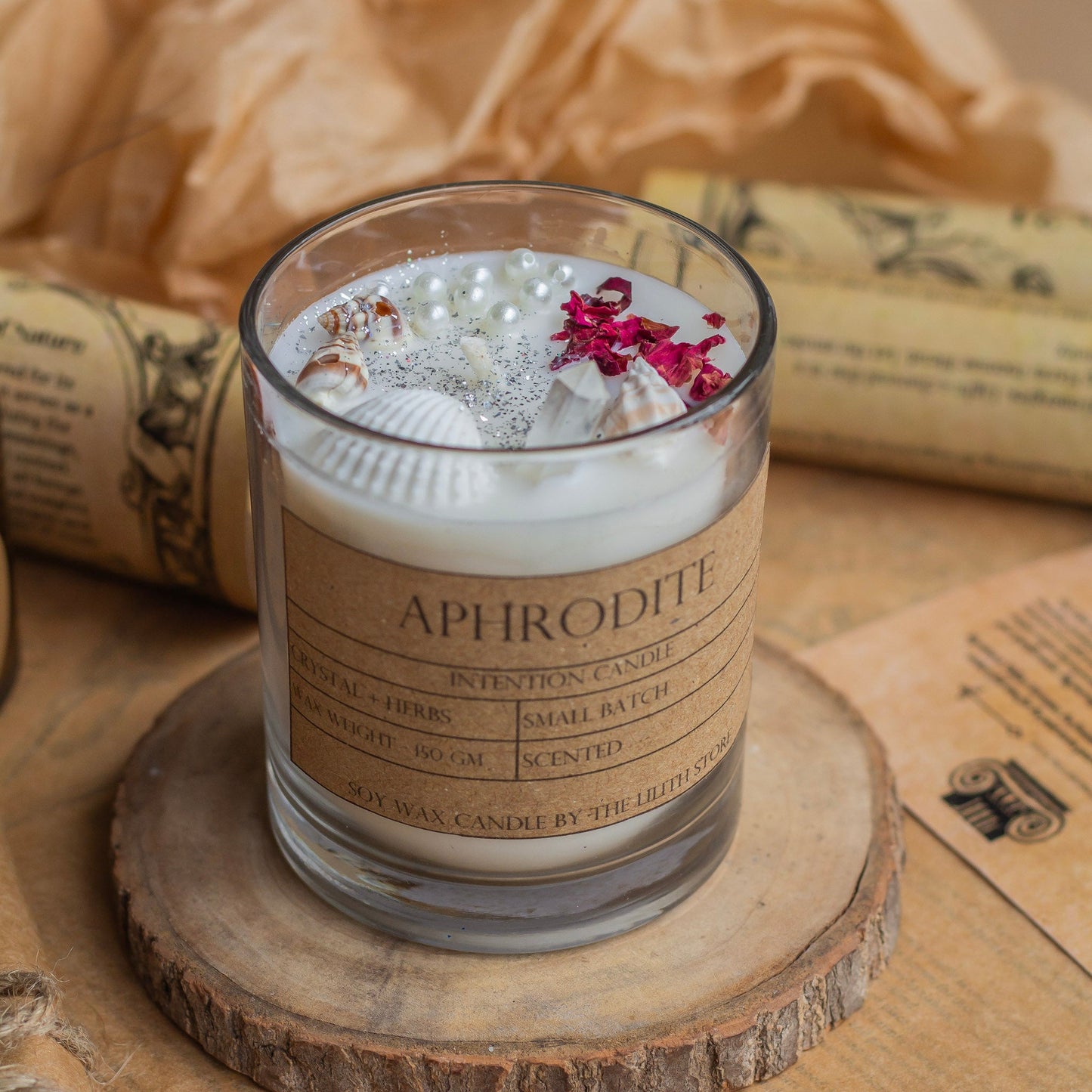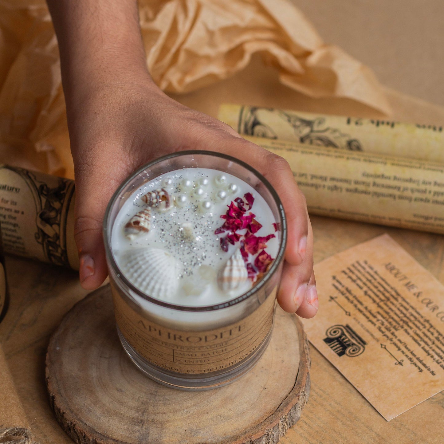 Crafted carefully to honor the goddess Aphrodite by infusing it with seashells, roses, pearls, and glitter. Light this candle when you want to invite Aphrodite's energies, power, and blessings into your life. You can use this candle to make an offering to her for help with spells related to beauty, love, glamour, and attraction.