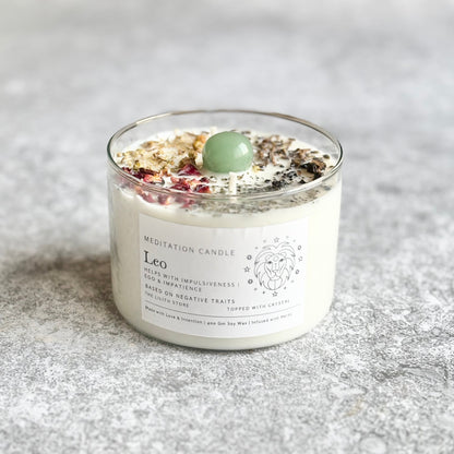 Overcome impulsiveness, ego, impatience, and dominating behavior with this intention candle, infused with Rose, Valerian, Lavender, and more. Made with soy wax and topped with a Green Aventurine tumble, it weighs approximately 400 gm and is perfect for meditation.