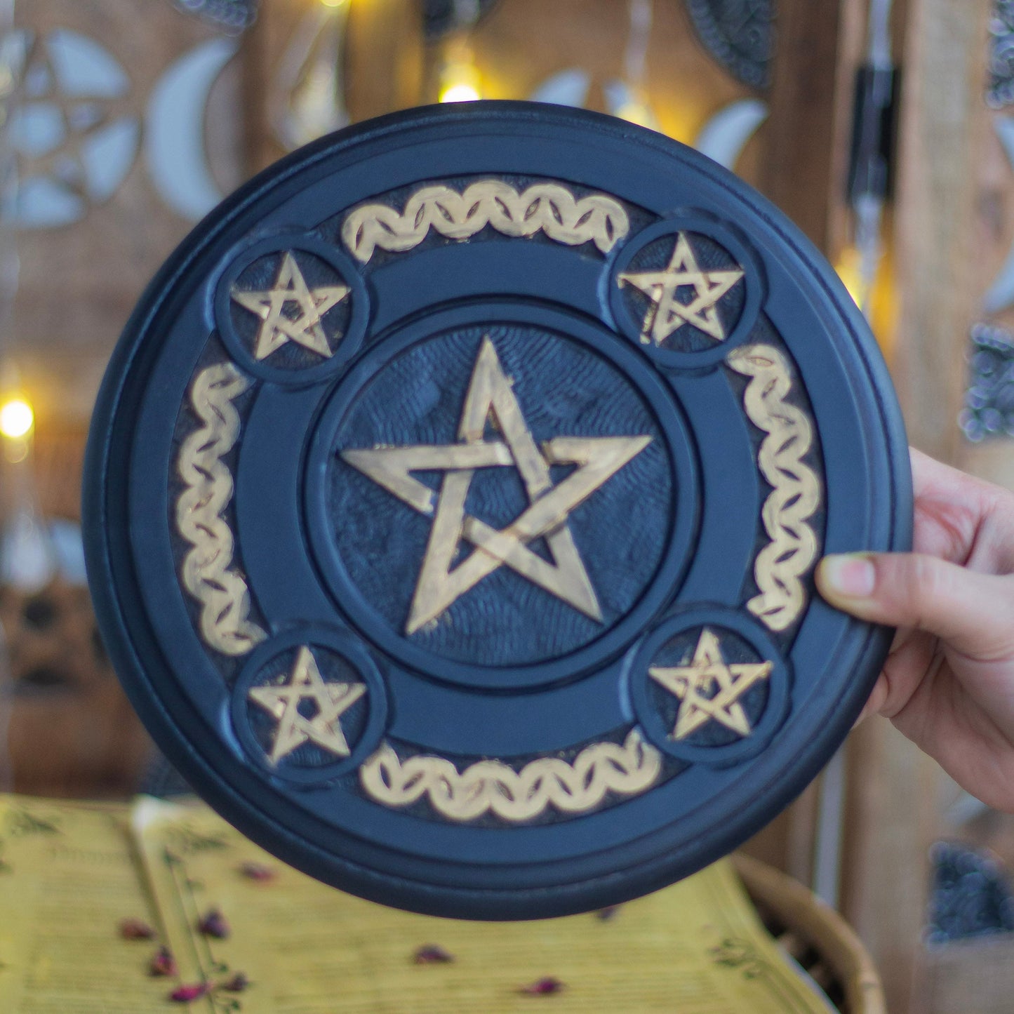 Pentacle Carved Black Wooden Altar Tile | Altar Decor