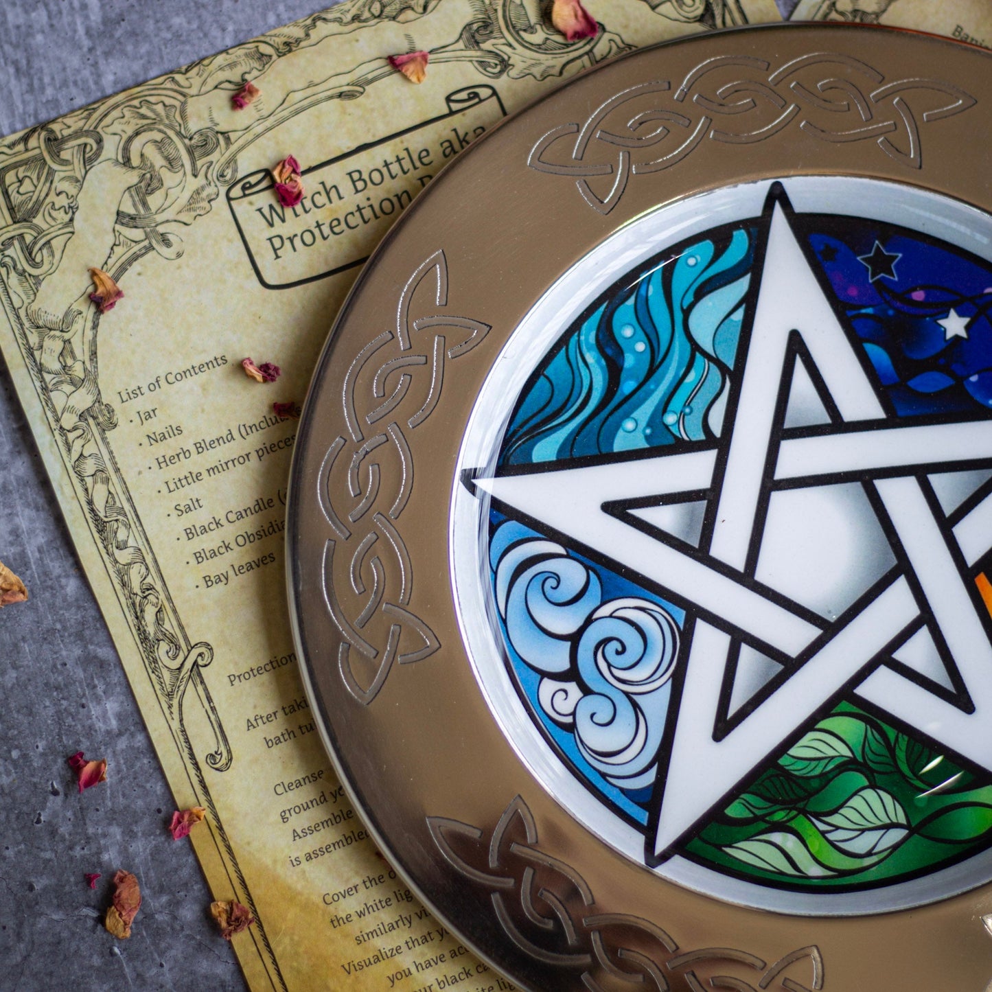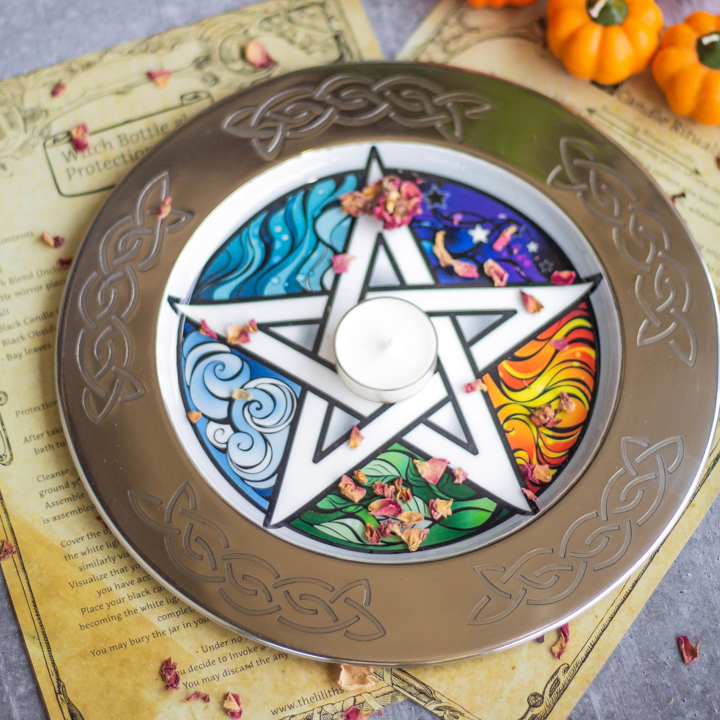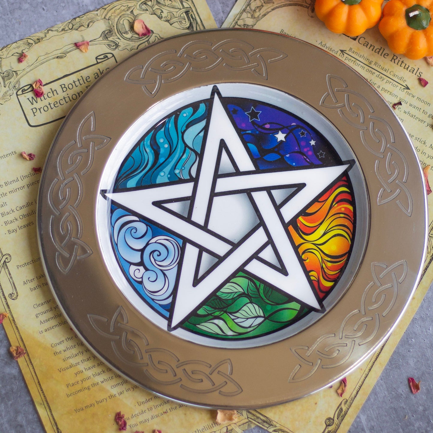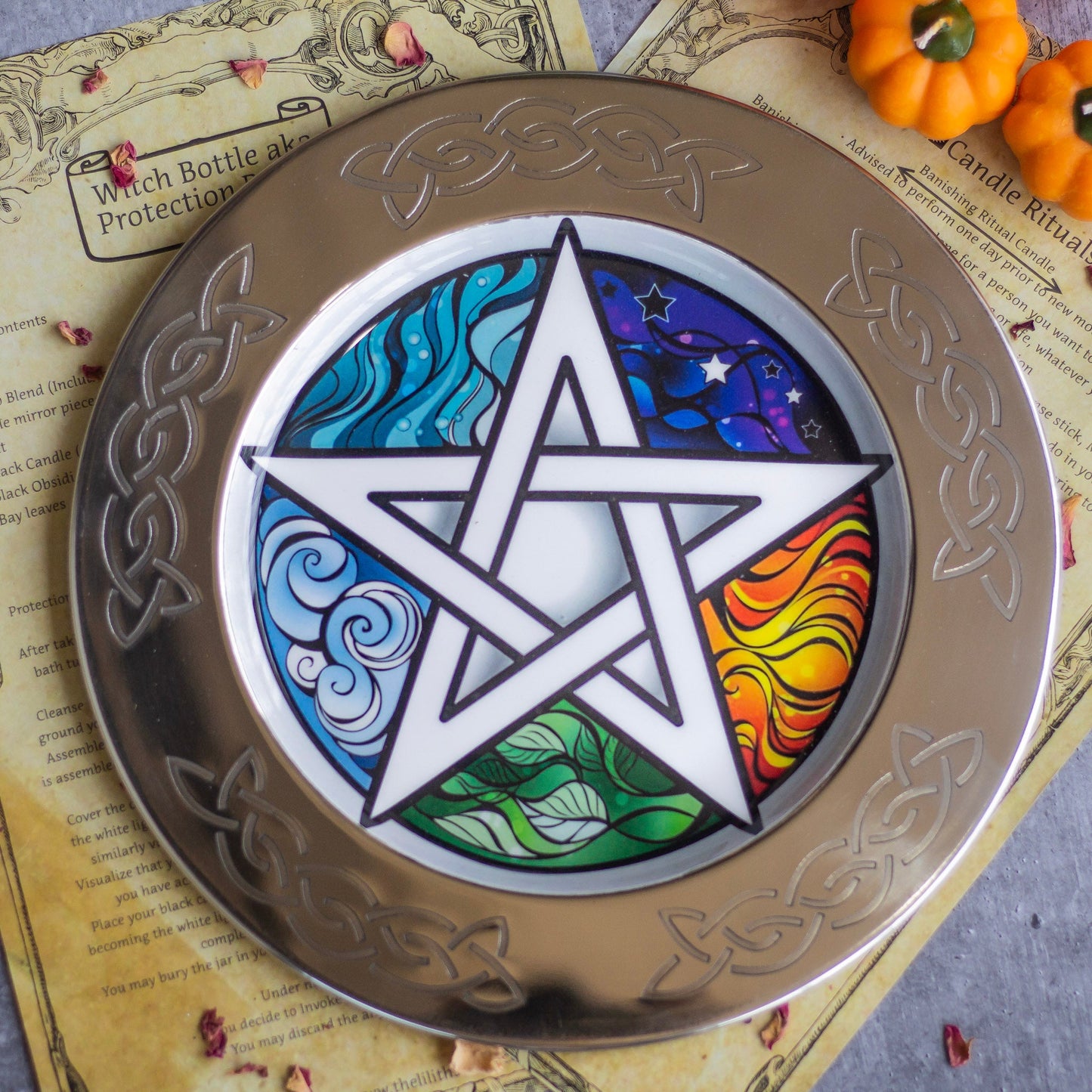 This 10-inch Steel Offering Plate features an intricate Pentacle and Element illustration, making it the perfect tool for energy work and ritual use. This robust and stylish plate is the ideal addition to any altar, and is perfect for those seeking an object of ritual for the occult.