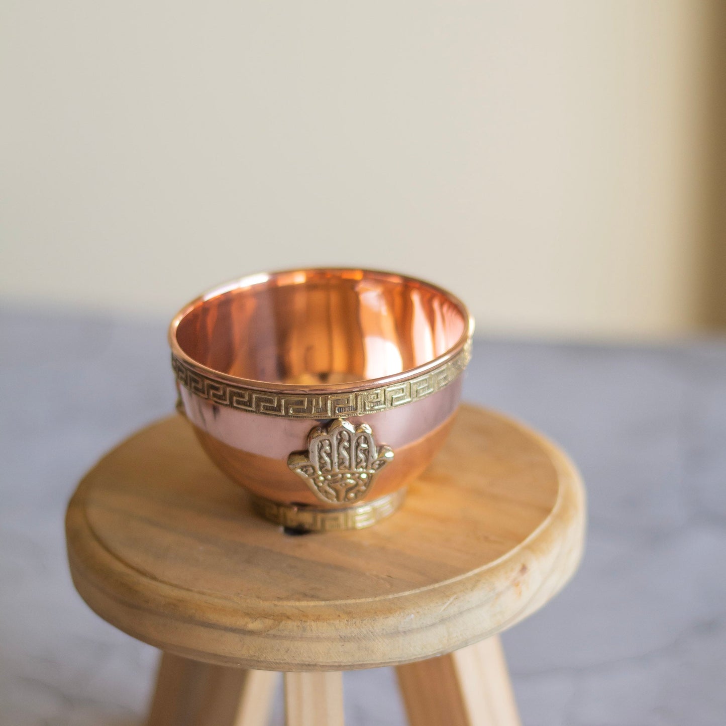 Enrich your spiritual practice with this elegant Hamsa-carved copper offering bowl. Its beautiful craftsmanship is both aesthetically pleasing and imbued with the power of protection. Perfect for any spiritual offering or sacred space.
