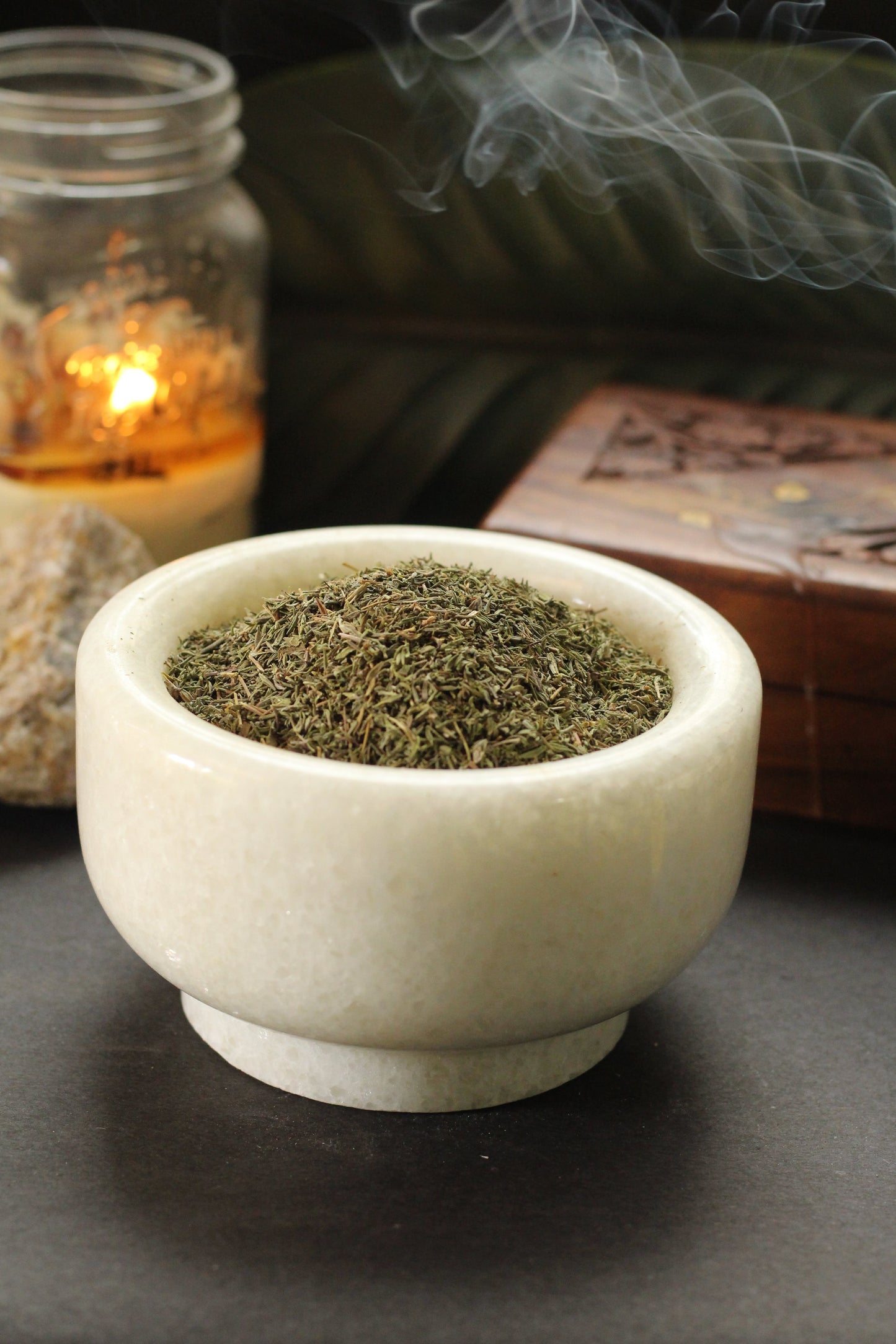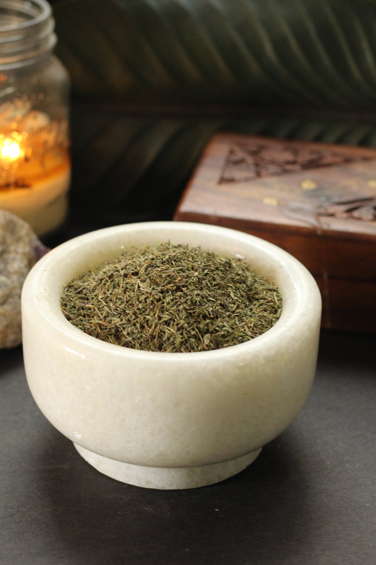 Thyme is also a purificatory herb; the Greeks burned it in their temples to purify them and so thyme is often burned prior to magical rituals to cleanse the area. In spring a magical cleansing bath composed of marjoram and thyme is taken to ensure all the sorrows and ills of the past are removed from the person.